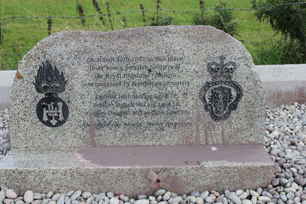 El monumento a los soldados, que fueron asesinados por el IRA en marzo de 1971 fue atacado en junio y julio, y dañado en otras ocasiones, en lo que parece una especie de fijación de los atacantes en vandalizar el monolito.
